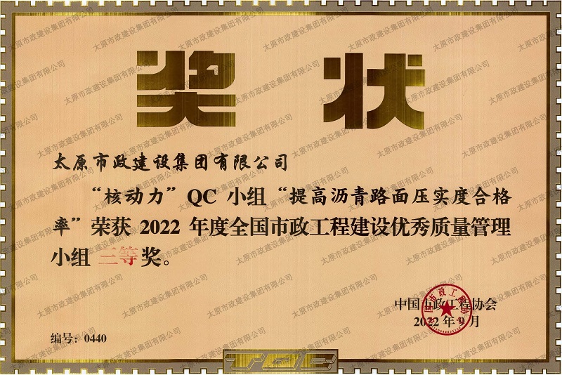 2022年度全國市政工程建設(shè)優(yōu)秀質(zhì)量管理小組三等獎_''核動力QC小組”提高瀝青路面壓實度合格率”